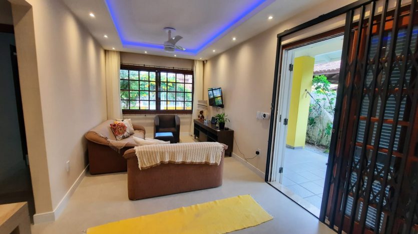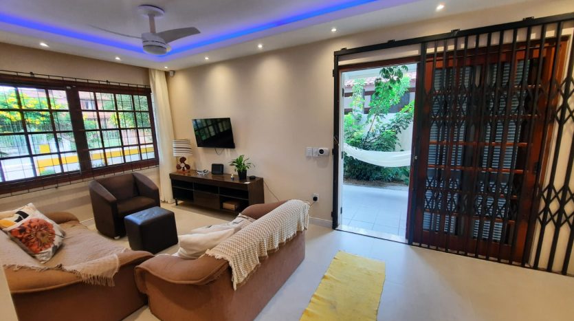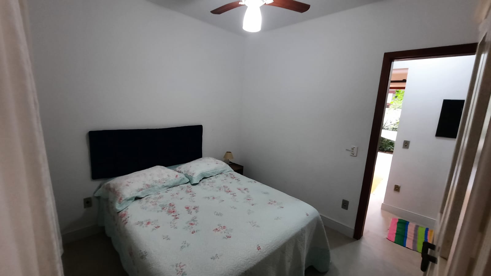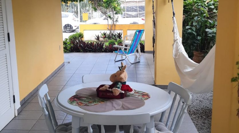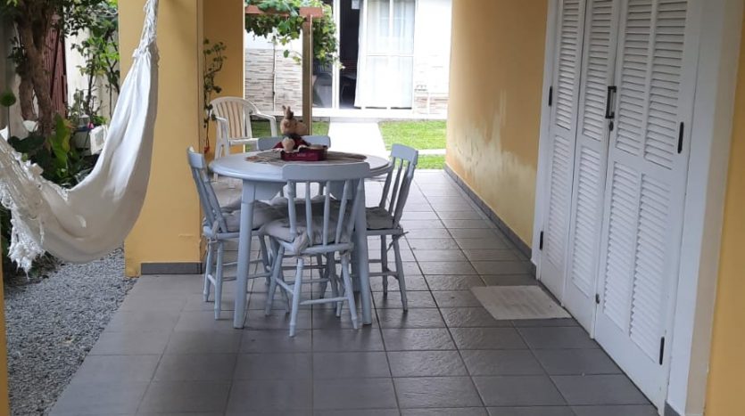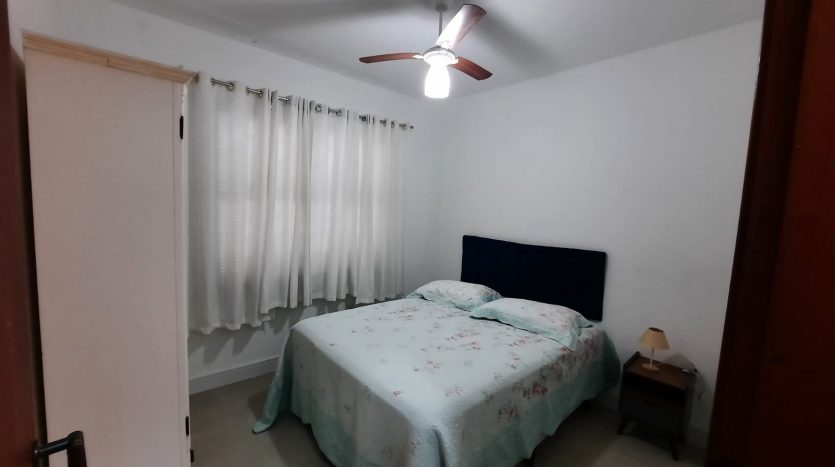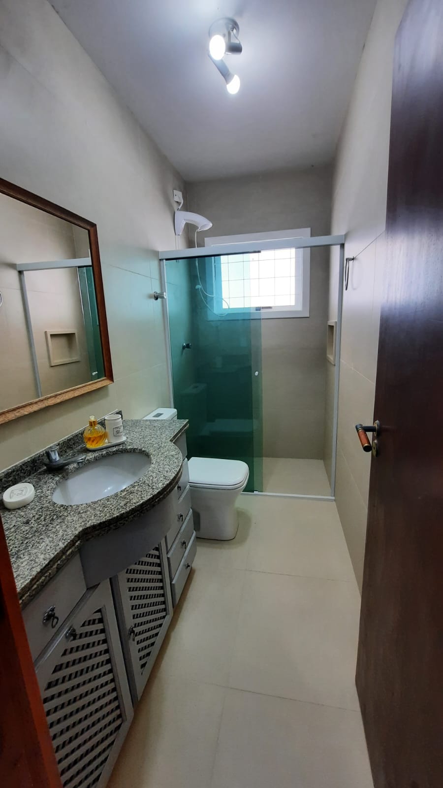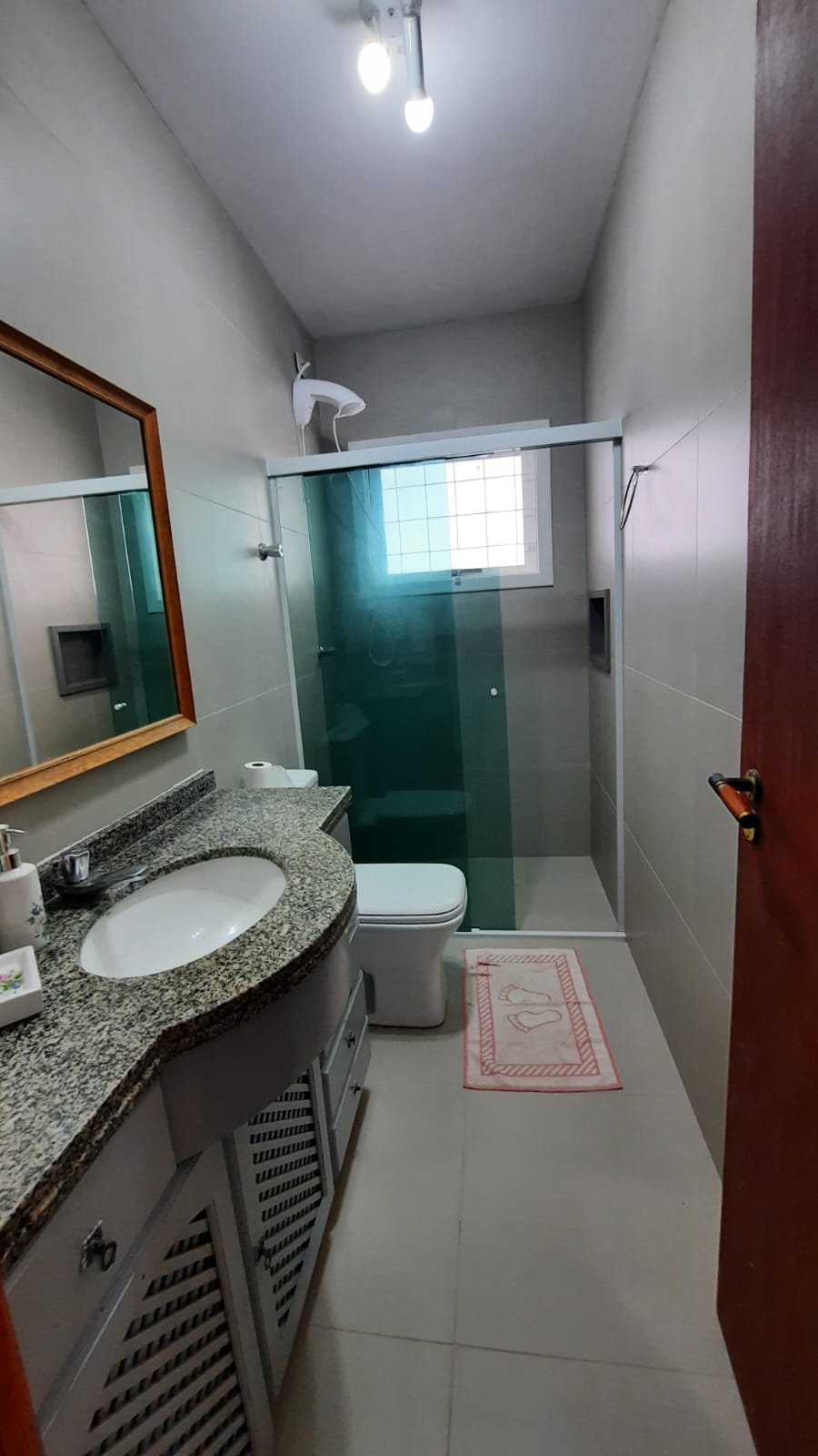 Sendo 1 suíte no quarto da frente c/ar condic., outros 2 quartos de casal com ar, sala conjugada com cozinha que possui ventiladores de teto, TV à cabo c/tela plana, wi-fi, ampla varanda em volta da sala, banheiro social.   Fundos: quarto de casal com ar condicionado, banheiro completo, cozinha e churrasqueira, jardim, 3 vagas de garagem, portão eletrônico.  Capacidade: 08/10 pessoas.  Valor da diária: R$ 900,00 + taxa de limpeza de R$ 400,00