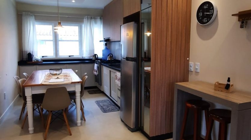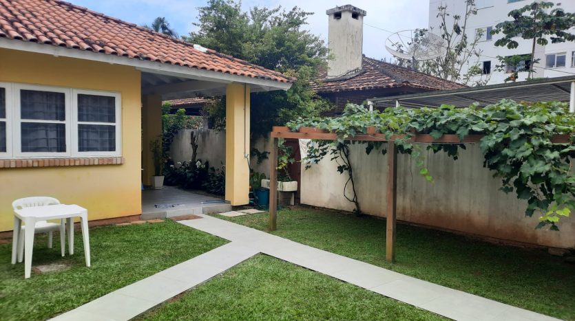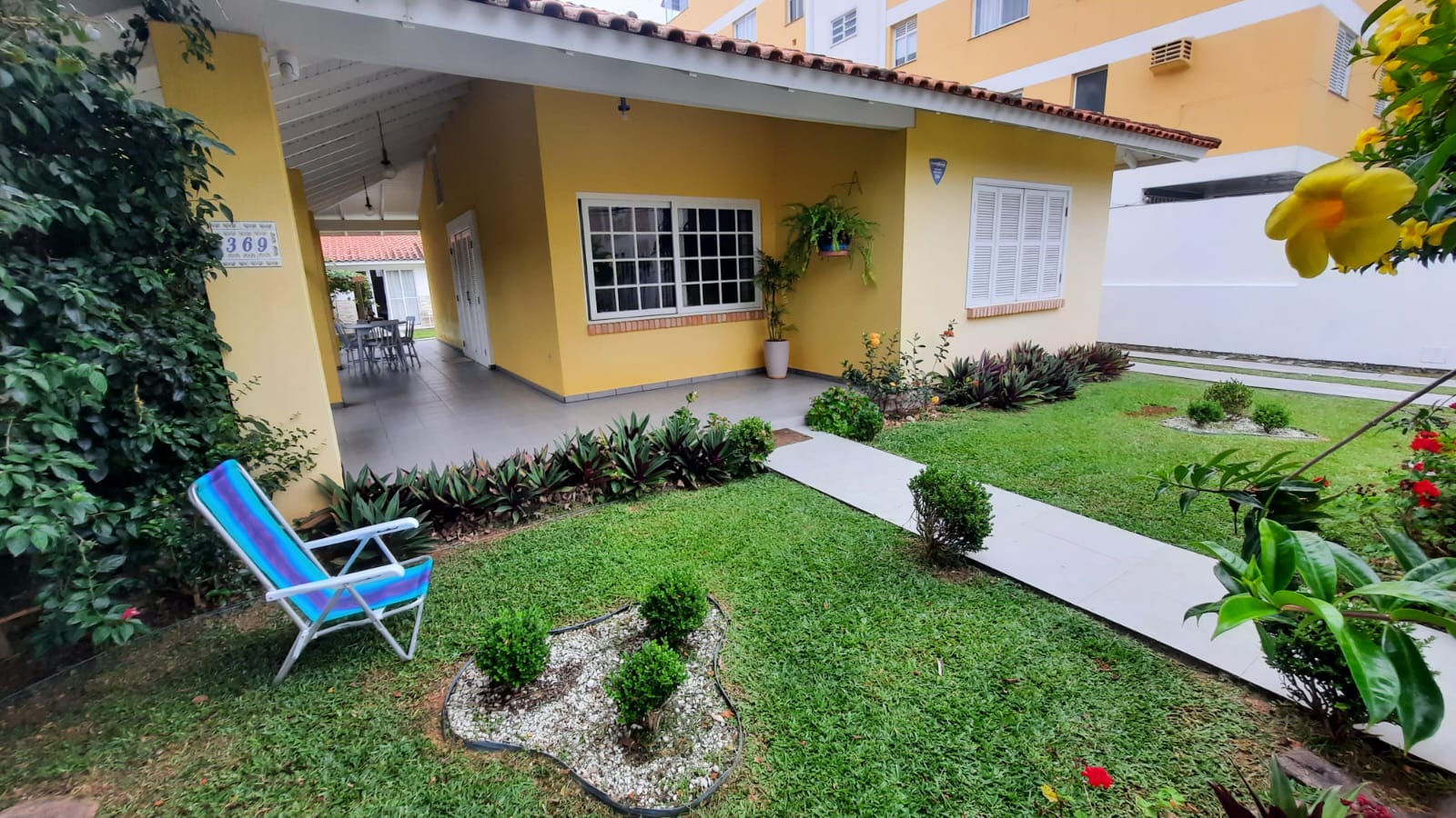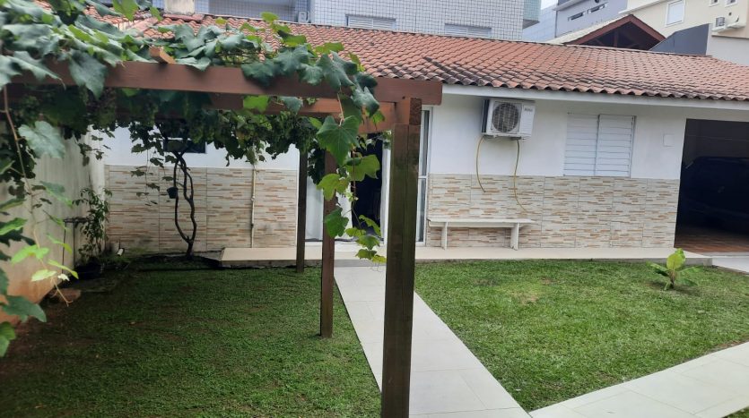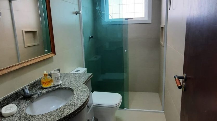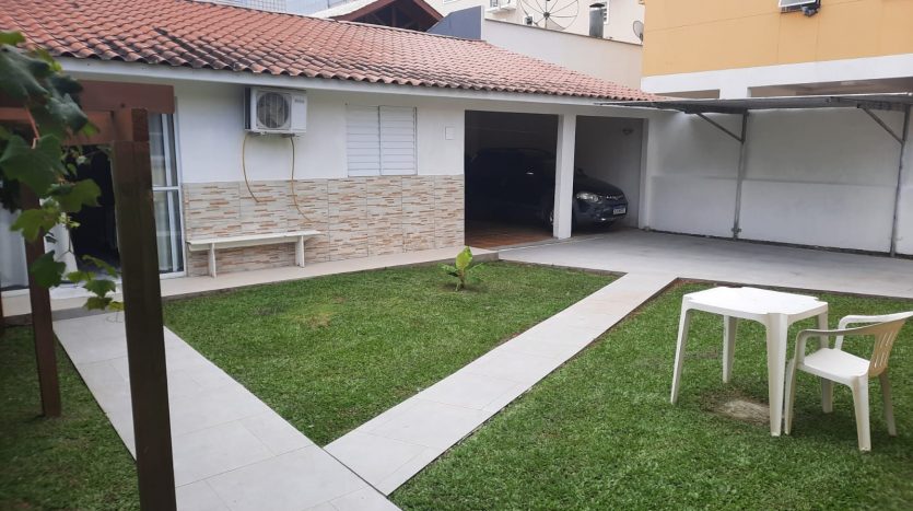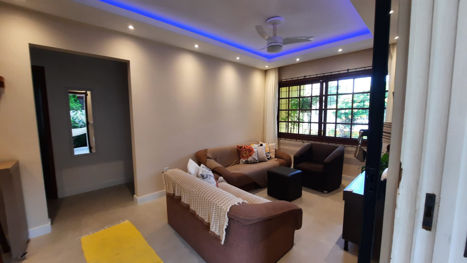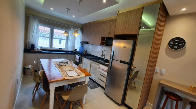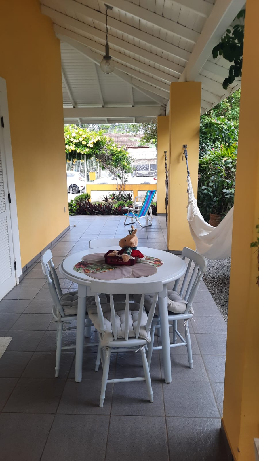 Sendo 1 suíte no quarto da frente c/ar condic., outros 2 quartos de casal com ar, sala conjugada com cozinha que possui ventiladores de teto, TV à cabo c/tela plana, wi-fi, ampla varanda em volta da sala, banheiro social.   Fundos: quarto de casal com ar condicionado, banheiro completo, cozinha e churrasqueira, jardim, 3 vagas de garagem, portão eletrônico.  Capacidade: 08/10 pessoas.  Valor da diária: R$ 900,00 + taxa de limpeza de R$ 400,00