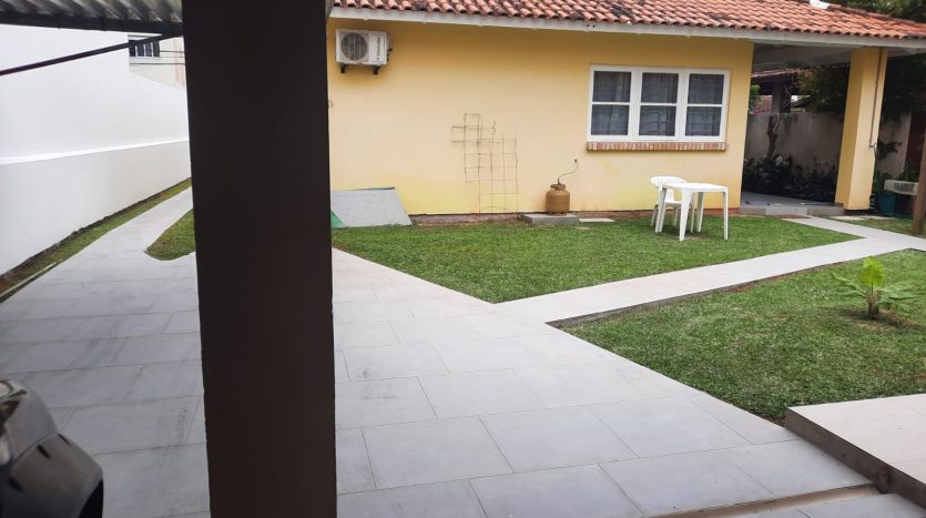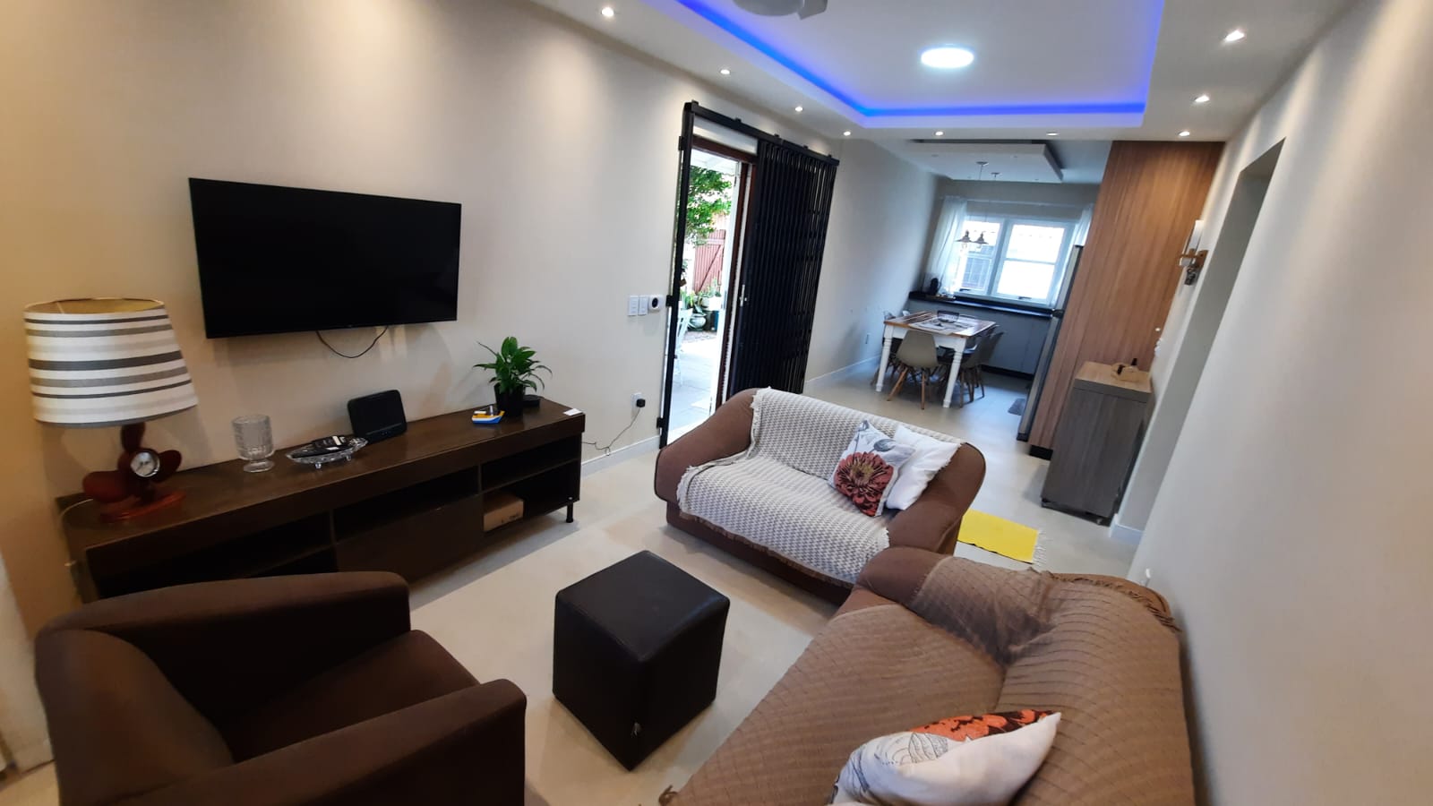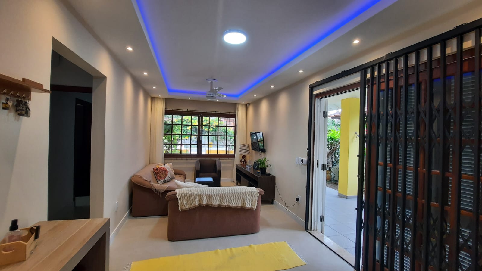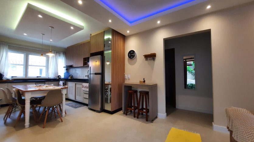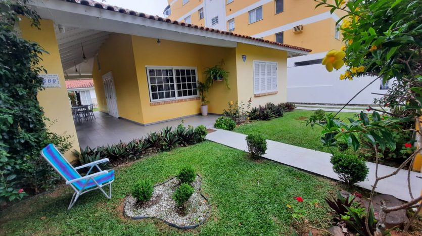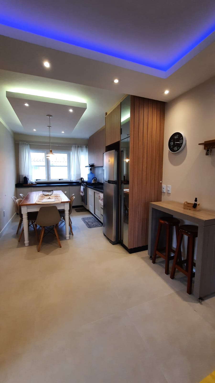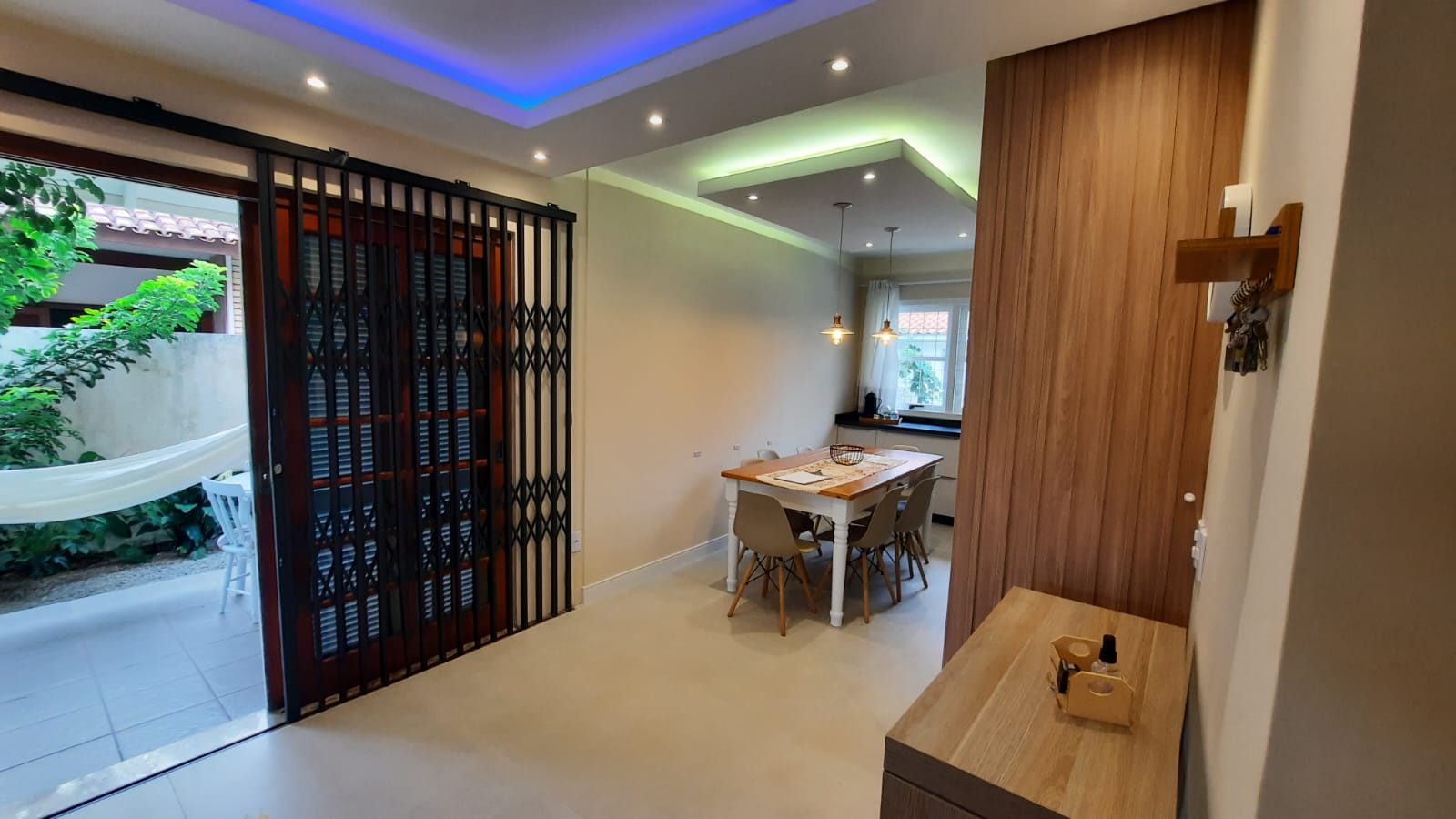 Sendo 1 suíte no quarto da frente c/ar condic., outros 2 quartos de casal com ar, sala conjugada com cozinha que possui ventiladores de teto, TV à cabo c/tela plana, wi-fi, ampla varanda em volta da sala, banheiro social.   Fundos: quarto de casal com ar condicionado, banheiro completo, cozinha e churrasqueira, jardim, 3 vagas de garagem, portão eletrônico.  Capacidade: 08/10 pessoas.  Valor da diária: R$ 900,00 + taxa de limpeza de R$ 400,00